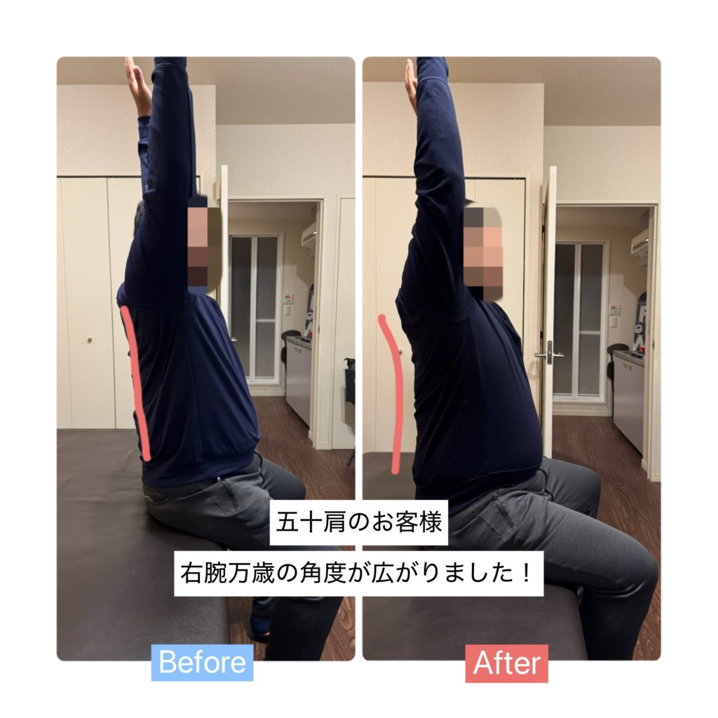 - 初回後:肩挙上の可動域が耳横まで拡大。上げた時の痛みも半分以下に。